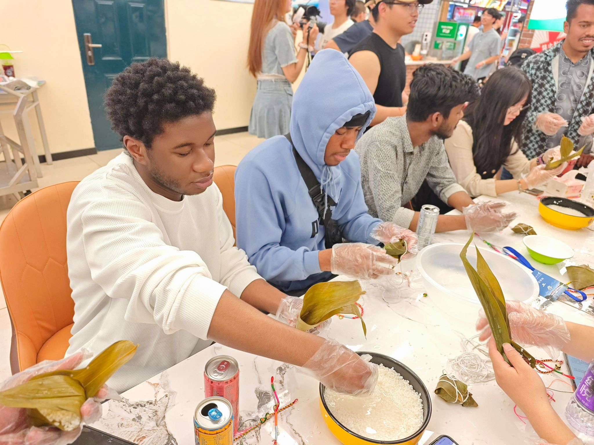 包粽子环节中,在包粽子能手的示范下,师生们兴致盎然地动起手来。一片片粽叶在大家手中翻转折叠,同学们专注学习折叶技巧,精研糯米与馅料的配比。中外学生友好协作,一同填入糯米和各种食材,再用棉线将粽子捆绑紧实,一个个精巧的粽子便逐渐成型。