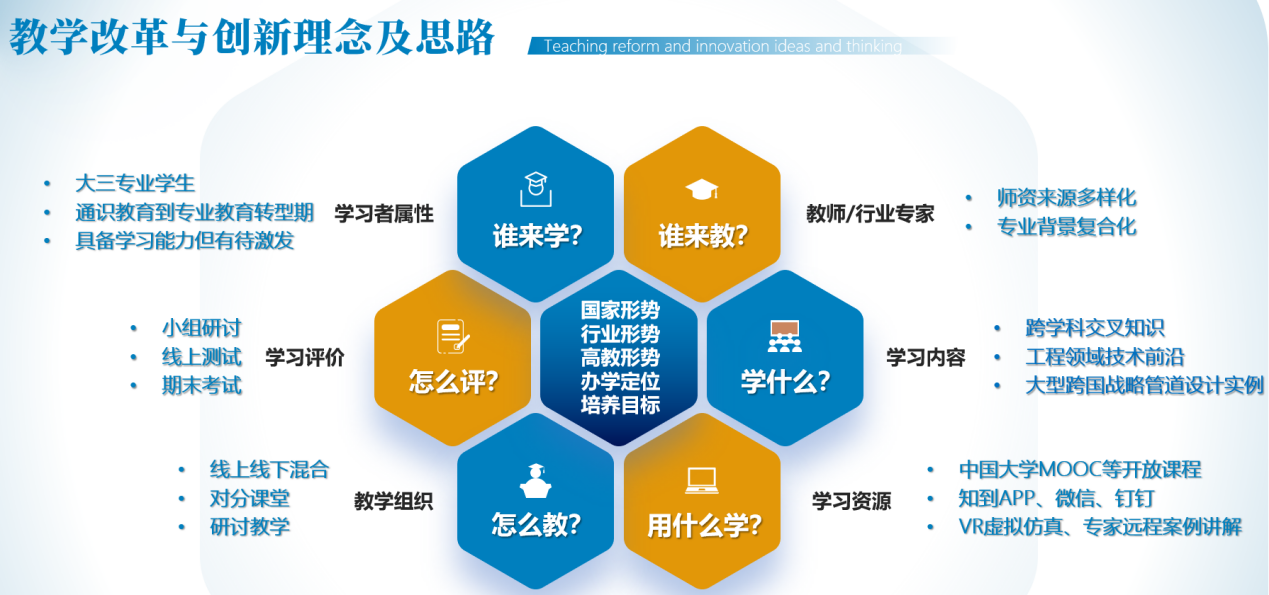 课程从金课建设“两性一度”要求出发,根据国家形势、行业形势、高教形势、学校办学定位以及专业人才培养目标,提出了思政融合、产教融合、科教融合、专创融合的“四融合”创新理念。总结教学经验,充分利用《输油管道设计与管理》专业主干课程这一优势,进行教学改革与创新,在明确“谁来学、谁来教、学什么、用什么学、怎么教、怎么评”的问题基础上,分别进行了以教学目标为指向的教学内容优化创新、以提升教学效果为目标的教学方式创新、着眼于激发学习动力的教学方法创新和以成果为导向的教学评价创新。